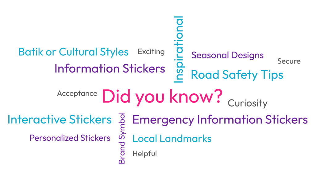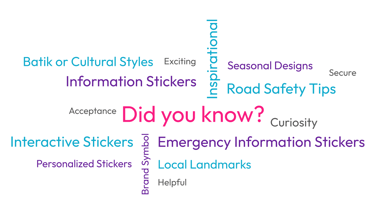 The ideation phase explored how to make insurance visible yet fun in everyday environments. Key themes included city love, safety awareness, emergency guidance, Batik/cultural patterns, and interactive stickers with QR codes. The goal was to balance utility, curiosity, and emotion, with styles ranging from friendly to bold. A word cloud and mood references guided creative exploration.
