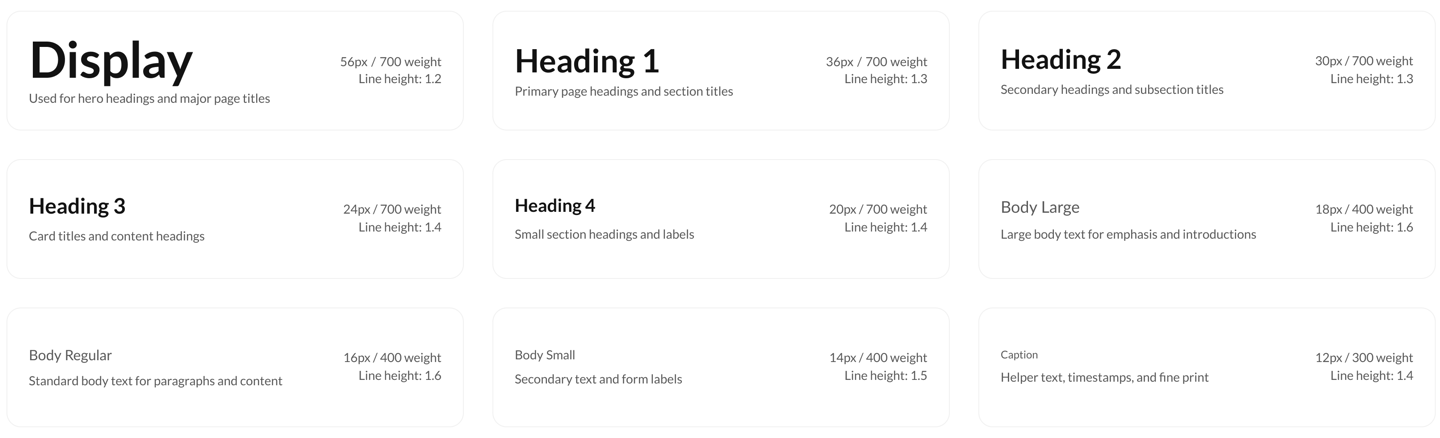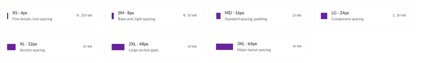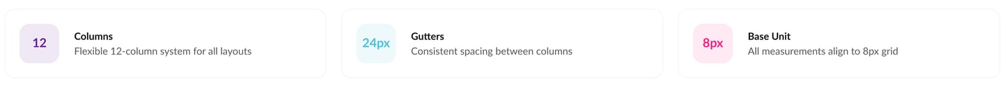 Our 8px base grid system ensures consistent spacing and alignment across all components and layouts, creating visual rhythm and hierarchy.