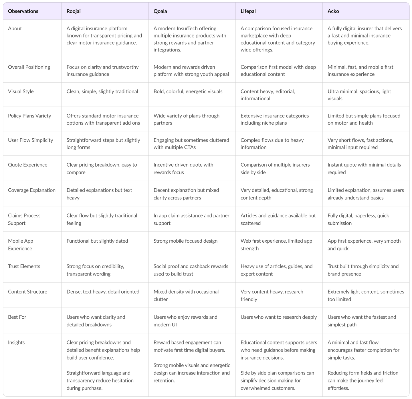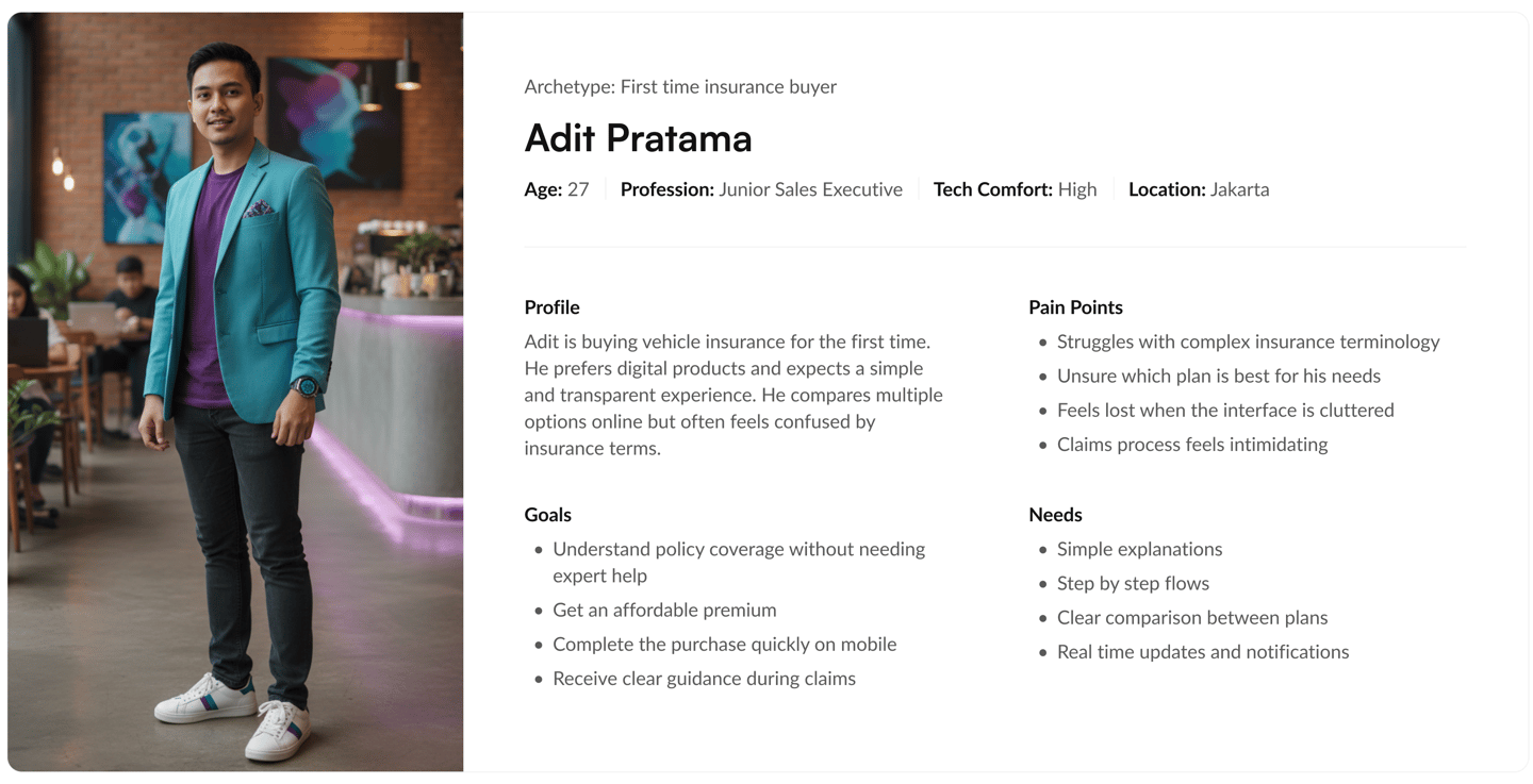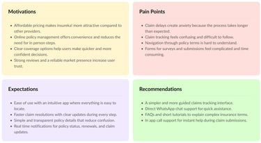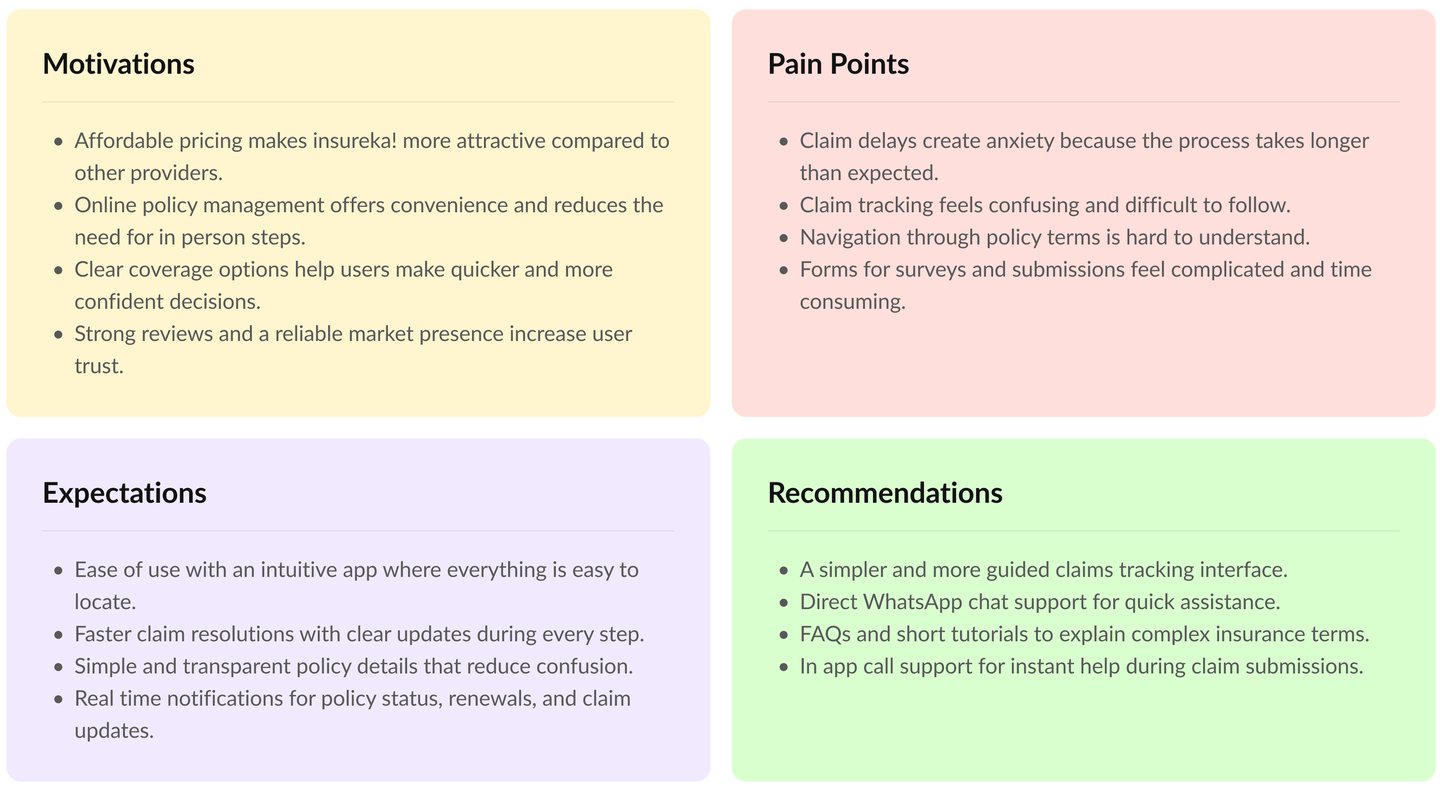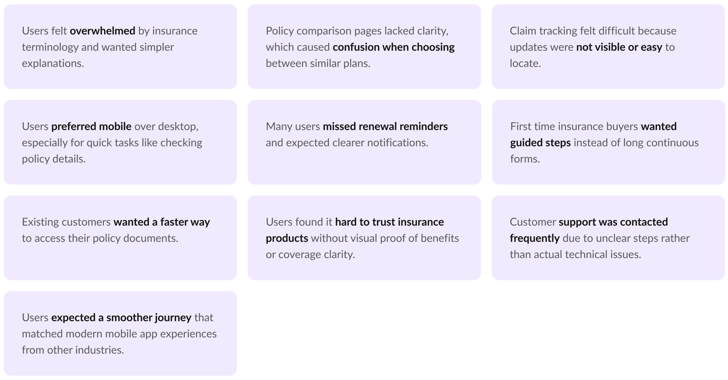 Interviews were conducted with both policyholders and first time insurance buyers to understand real behaviors, motivations and frustrations. These conversations revealed practical challenges that shaped the direction of design.