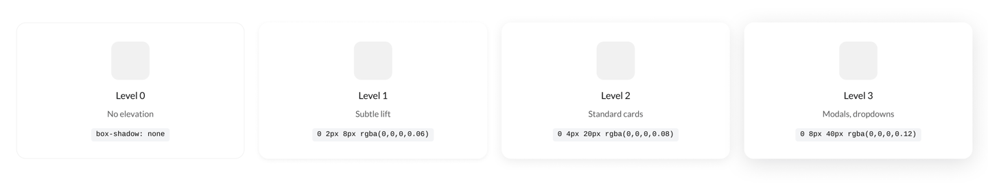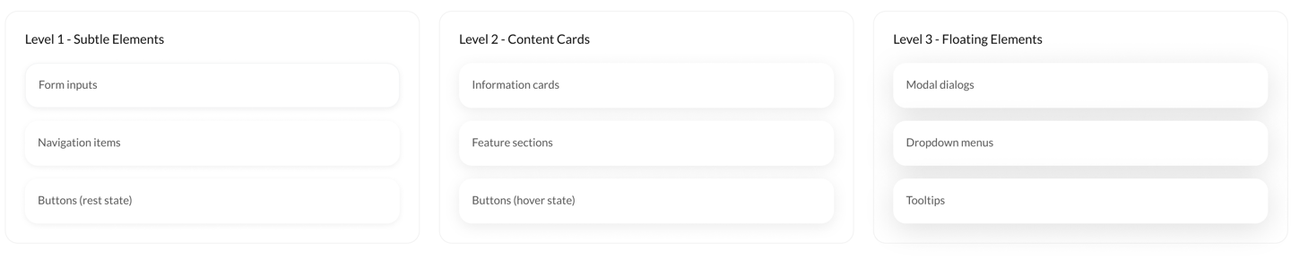 Subtle shadows create depth and hierarchy, helping users understand the interface structure while maintaining our clean, approachable aesthetic.