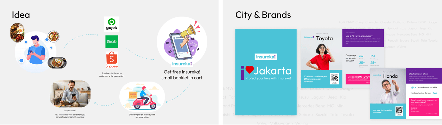The insureka! booklet was reimagined as a lightweight, engaging insert distributed through everyday delivery platforms like Gojek, Grab, and Shopee. By partnering with these services, the booklet reached users in a natural moment—while enjoying a meal—turning wait-time into a chance to explore insurance benefits. The content was designed to be instantly understandable and actionable, making insurance feel approachable and relevant, right at their fingertips.