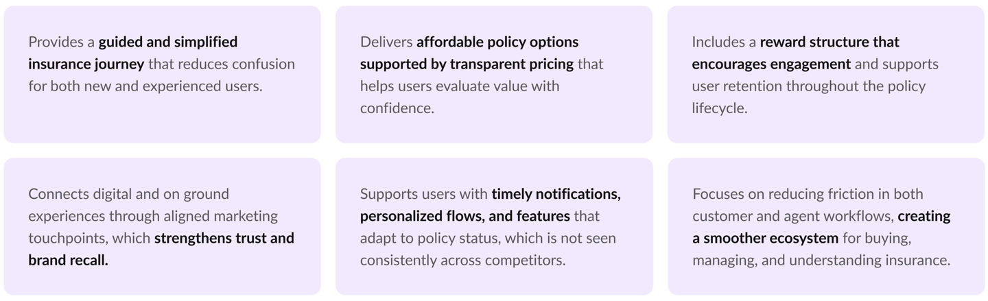 Highlights the unique strengths that set insureka! apart from competitors, focusing on clarity, affordability, consistency and user centered features across the entire insurance journey.