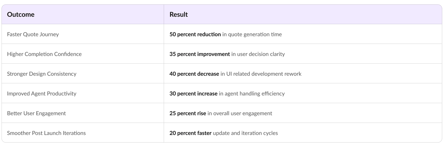 The measurable improvements created by the redesign, covering user experience, platform efficiency, and team productivity. Each impact reflects how the updated design strengthened clarity, consistency, and overall product performance.