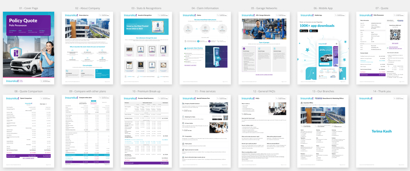 The redesigned digital PDF was structured for A4 viewing and optimized for readability across devices. It features clearly defined sections for pricing, coverage highlights, add-ons, and disclaimers. Visual elements like icons and highlight blocks make complex information more accessible. A scannable QR code or link directs users to complete their purchase or contact support instantly. The color scheme, fonts, and tone are aligned with insureka!’s digital ecosystem, reinforcing consistency across touchpoints.