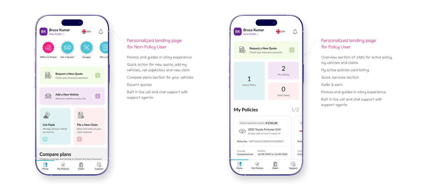 The landing page adapts based on user type, creating personalized experiences for both new and existing customers. Quick actions, service shortcuts, and story style promo cards help users move faster through frequently used features. The layout keeps essential tools like quotes, claims, and vehicle management within immediate reach.