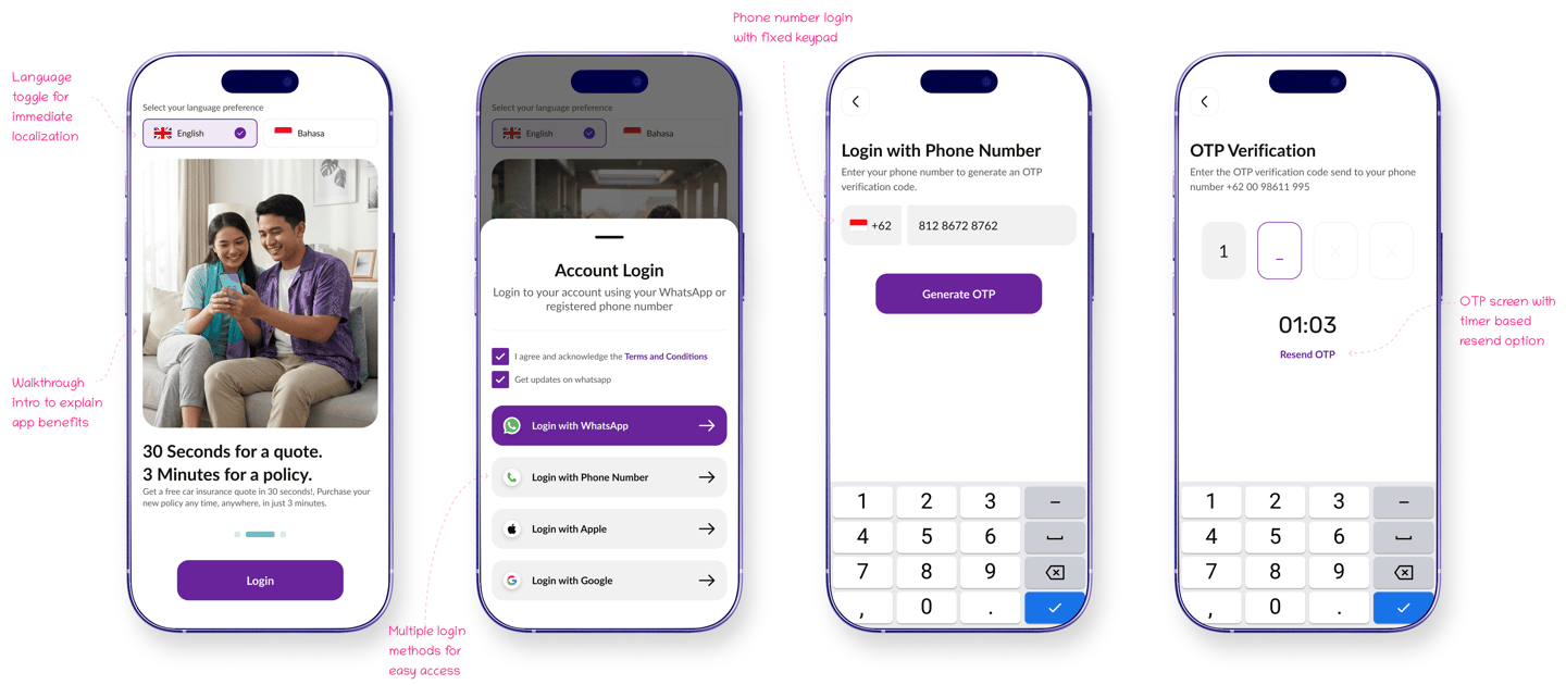The onboarding experience introduces users to the app with language selection and a simple walkthrough of key features. Multiple login options such as WhatsApp, phone number, Google, and Apple make access quick and flexible. OTP verification is streamlined with a fixed keypad and countdown based resend actions for smoother completion.