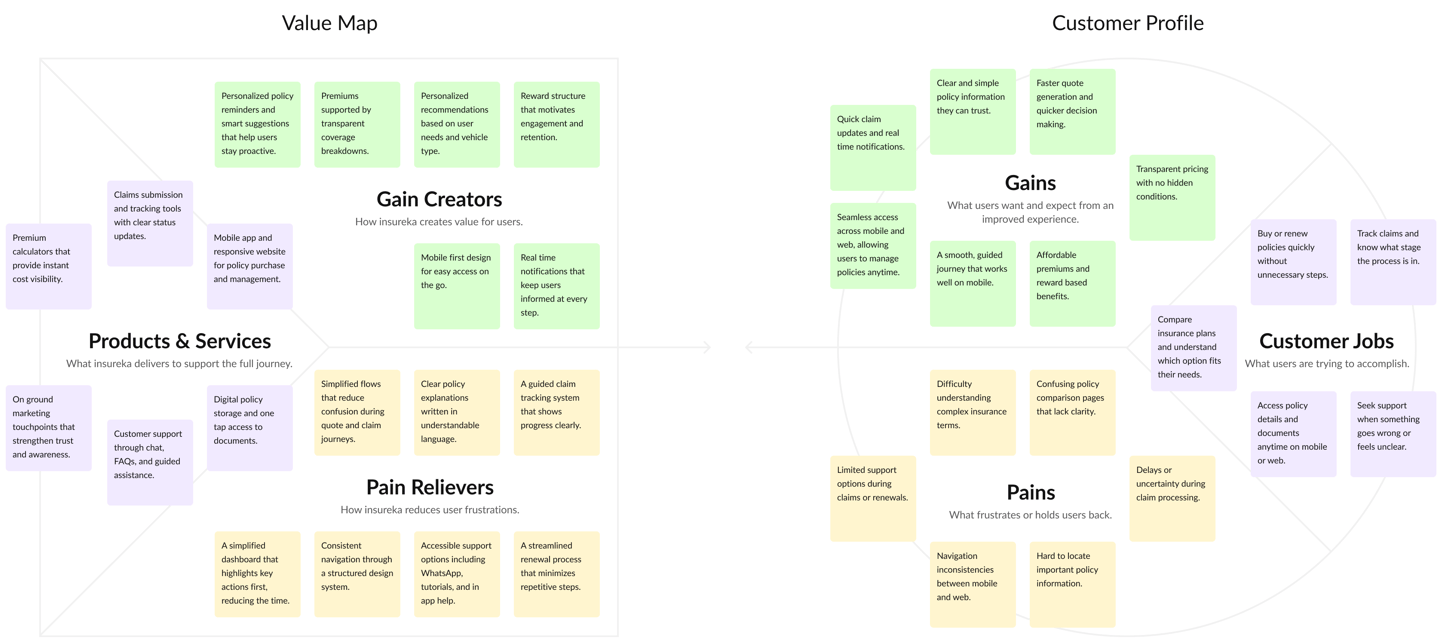 To understand how users interact with insureka! from start to finish, we mapped out the entire journey—from discovering the platform to purchasing a policy and managing claims. This helped us identify key friction points and emotional highs/lows in the user experience.