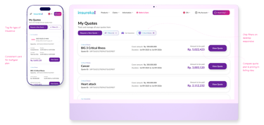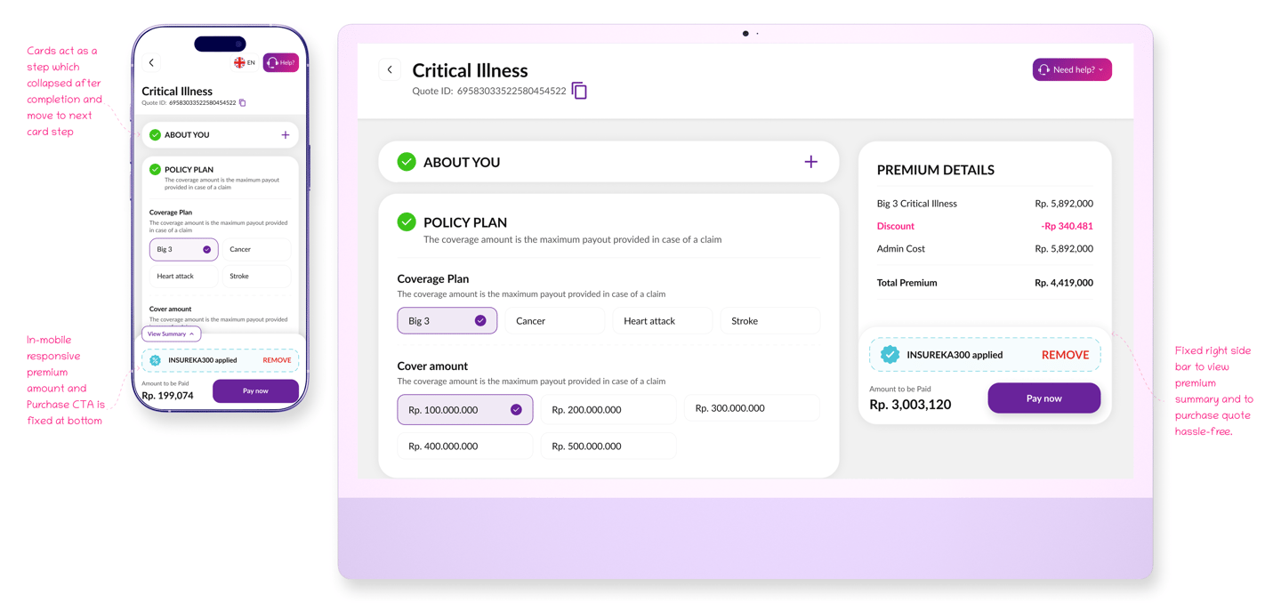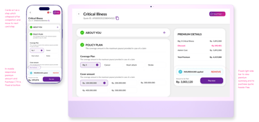 The critical illness flow uses collapsible card steps to guide users through each part of the quote process in a simple and structured way. Premium summaries remain fixed for easy review, and mobile layouts ensure smooth navigation on smaller screens.