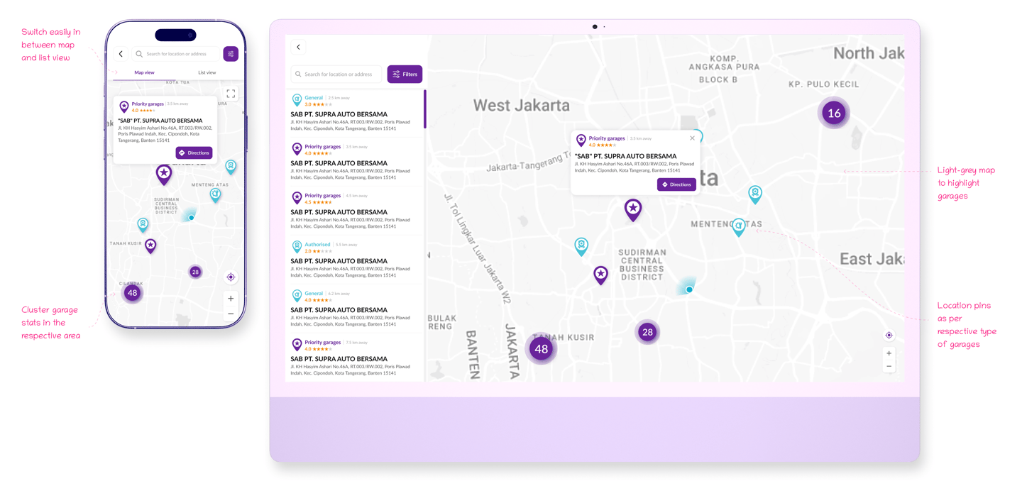 The map and list view switch enables users to explore nearby garages effortlessly based on their preferred view. Clustered pins reveal garage density, while color coded markers distinguish garage types, helping users make quick and confident decisions.