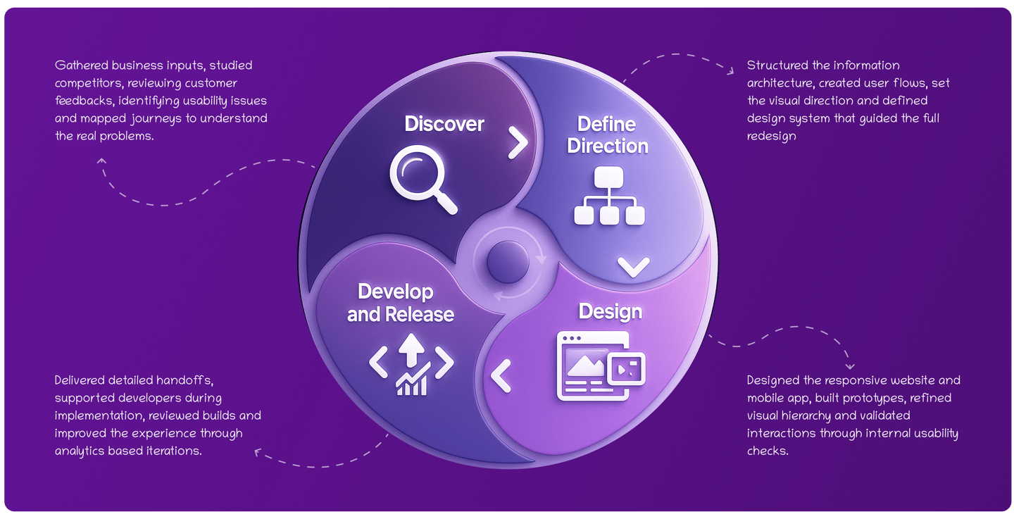 My role was to redesign the platform with a clear, user centered approach. I focused on removing unnecessary friction, reorganizing the information architecture, and creating a visual language that felt simple, modern, and trustworthy. I also built a modular design system that helped unify the product experience and support future scalability.