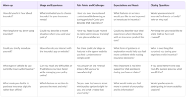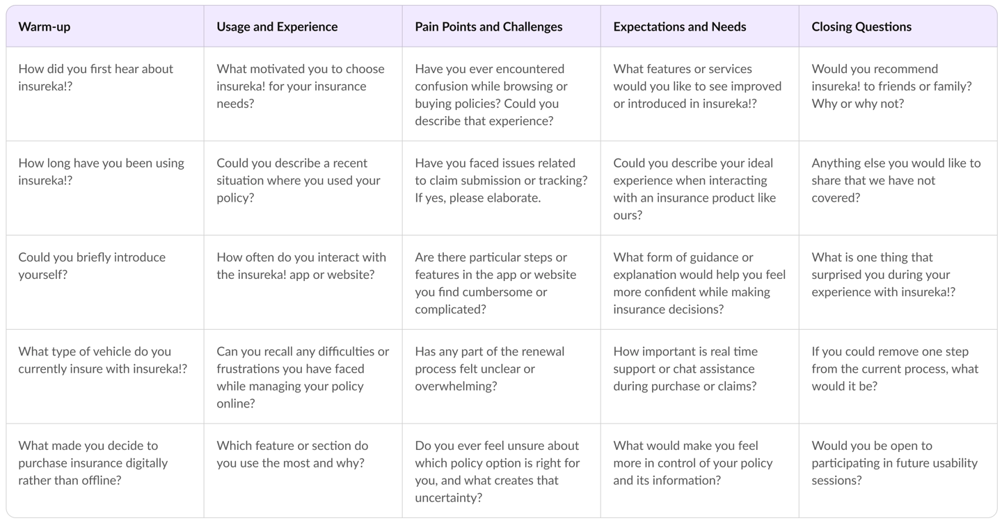 A structured question set was created to guide conversations across warm up, usage patterns, pain points, expectations and closing feedback. This ensured consistency during interviews and made insights easier to compare and analyze.