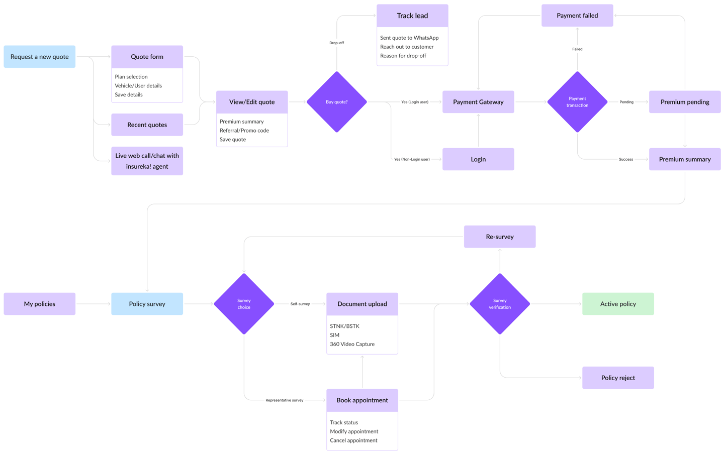 To ensure intuitive and frictionless navigation, we designed detailed user flows for all major actions users would take across insureka!’s web and mobile platforms. Streamline the user experience by mapping out step-by-step paths for key user goals. This ensured clarity, minimized dead ends, and helped align design and development teams early on.