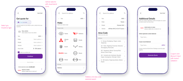 The policy purchase flow guides users step by step through selecting vehicle details, reviewing coverage, and applying coupons. Visual selectors, collapsible cards, and fixed premium summaries keep the process simple and easy to follow. Rewards, add ons, and pricing breakdowns are clearly presented to support confident decision making.