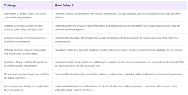 Working on the insureka! ecosystem reinforced the value of designing with clarity and consistency across multiple touchpoints. The project highlighted how important it is to simplify insurance language and present information in a way that supports confident decision making. Cross functional collaboration also proved essential for aligning business rules, technical constraints, and user needs into a unified product direction.