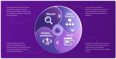 A structured four-phase approach: Discover, Define Direction, Design and Develop & Release has helped redefine insureka!'s user experience, turning insights into a smoother and more user-centric journey.